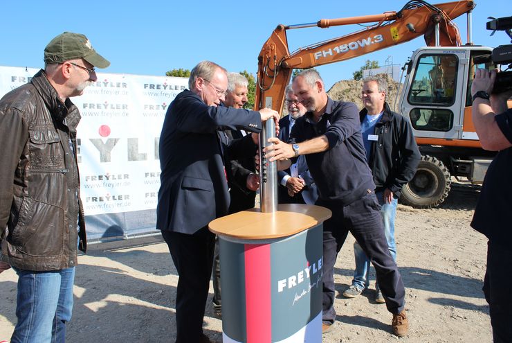 Die Dach Schutzbekleidung GmbH & Co. KG aus Bietigheim feierte am 28.09.2016 mit Industriebauspezialisten FREYLER Industriebau Ettlingen den Spatenstich