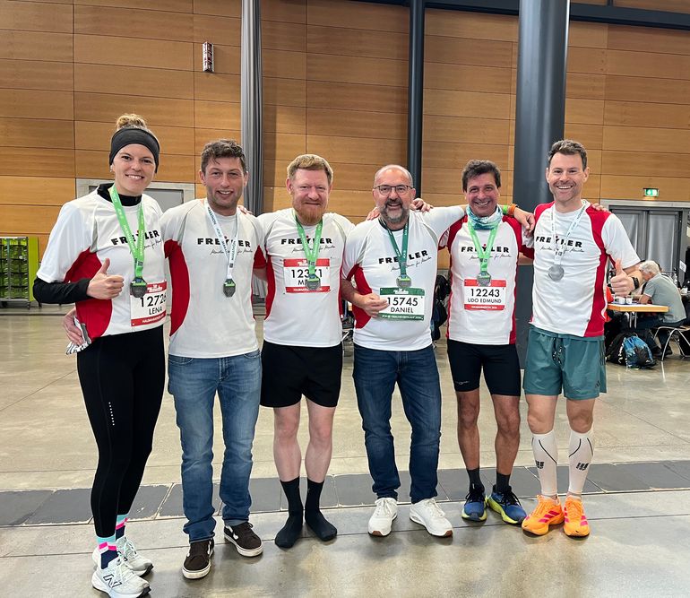 An der Strecke entlang der Dreisam und durch die Freiburger Innenstadt sorgten mehr als 30 Bands und begeisterte Zuschauerinnen und Zuschauer für mitreißende Stimmung. Trotz Schmuddelwetter wurde gelacht, angefeuert und gemeinsam durchgehalten. Der Höhepunkt wartete schließlich im Ziel auf dem Freiburger Messegelände: Unter dem Jubel der Menge wurden die Läuferinnen und Läufer empfangen – erschöpft, aber überglücklich. Auch unser FREYLER-Team durfte diesen Moment genießen.