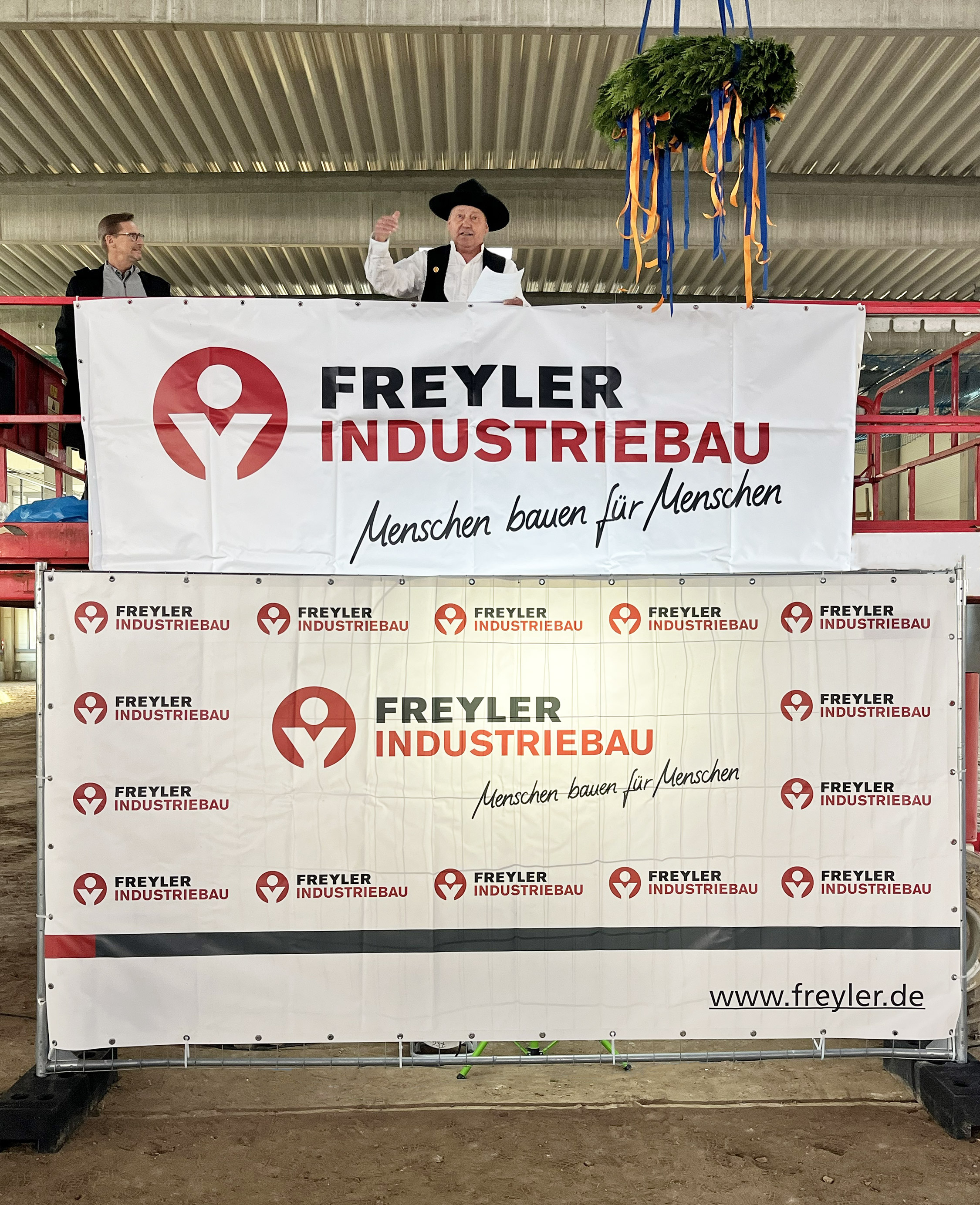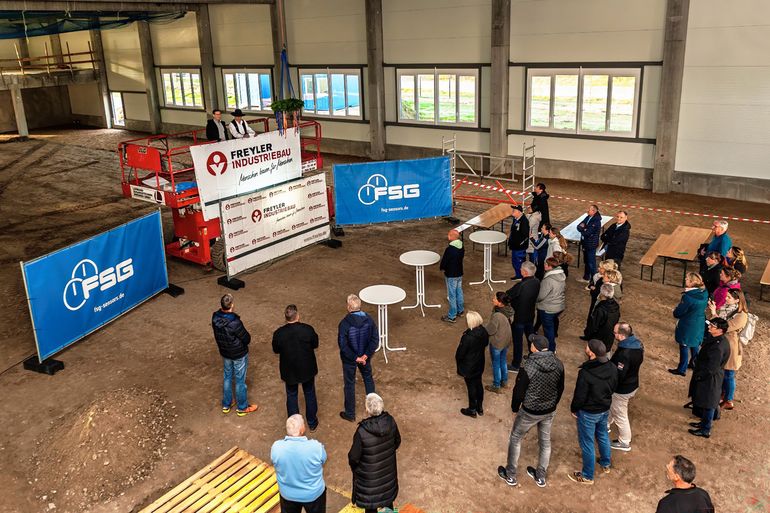 Mit Zimmermannskluft, guter Laune und einem originellen Richtspruch unseres Leipziger FREYLER Kollegen Falko Kranz feierte die FSG Fernsteuergeräte Ende Oktober das Richtfest ihrer neuen Produktionshalle. Im frisch erstellten Rohbau wurde damit ein wichtiger Schritt Richtung Zukunft besiegelt: Bis zum Frühjahr 2026 entstehen im Ortsteil Zernsdorf in Königs Wusterhausen eine rund 1.800 m2 große Produktions- und Lagerhalle sowie 700 m2 Verwaltungsflächen – eine Erweiterung, die den 2017 eröffneten Standort nachhaltig stärken wird.