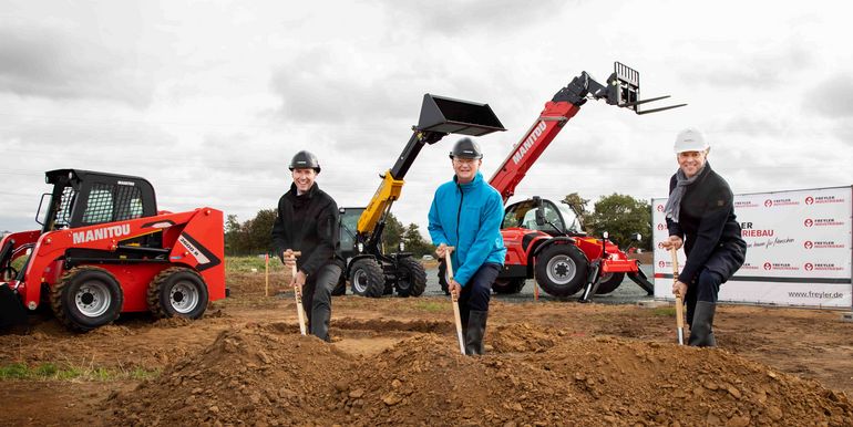 Die französische Manitou-Gruppe gehört mit ihren Teleskopladern sowie Gelände- und Industriestaplern zu den Weltmarktführern. Nachdem die deutsche Firmenzentrale in Ober-Mörlen aus Kapazitätsgründen an ihre Grenzen stößt, soll jetzt im nur 25 km entfernten Friedrichsdorf ein neues Lager mit Verwaltungsgebäude und Schulungszentrum entstehen. Mit einem offiziellen Spatenstich wurde am 5. Oktober unter Beisein des Friedrichsdorfer Bürgermeisters der Baustart gefeiert. Konzept, Planung und bezugsfertige Ausführung liegt in den Händen von FREYLER Industriebau Darmstadt, die Fertigstellung des Komplexes ist für Oktober nächsten Jahres geplant.