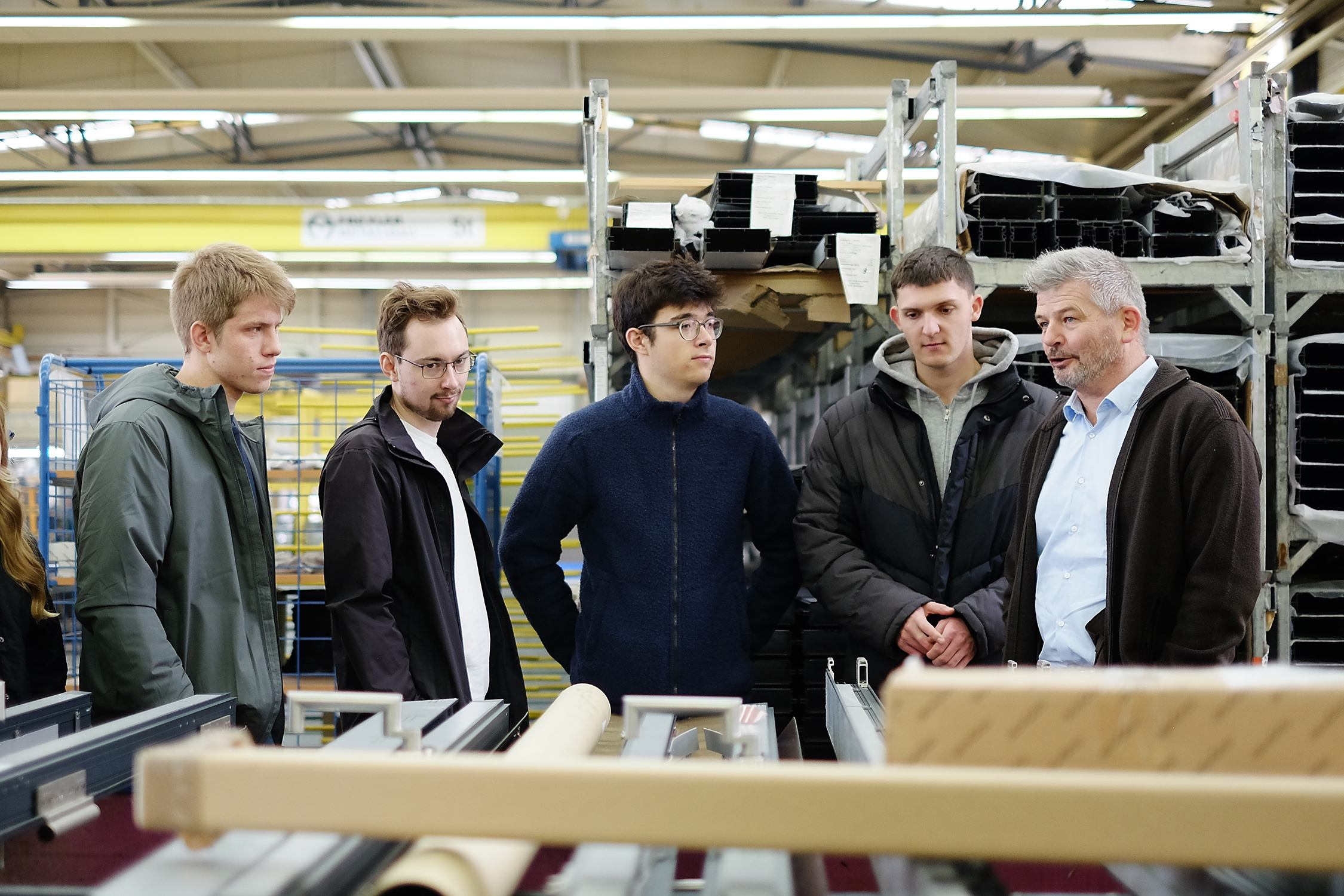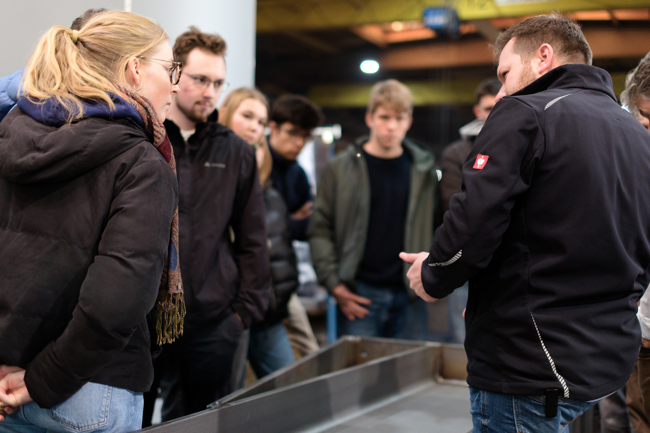 Anschließend führte Stefan Gauss, Geschäftsbereichsleiter FREYLER Metallbau GmbH, durch die Metallbaufertigung, wo insbesondere Fassadenkonstruktionen aus Stahl, Edelstahl und Aluminium entstehen. Auch hier konnten die Studierenden den FREYLER Mitarbeitenden über die Schulter schauen: beim Schneiden, Schleifen, Schrauben und Montieren der einzelnen Bauteile. Ein Einblick in die Qualitätssicherung rundete den Besuch ab.