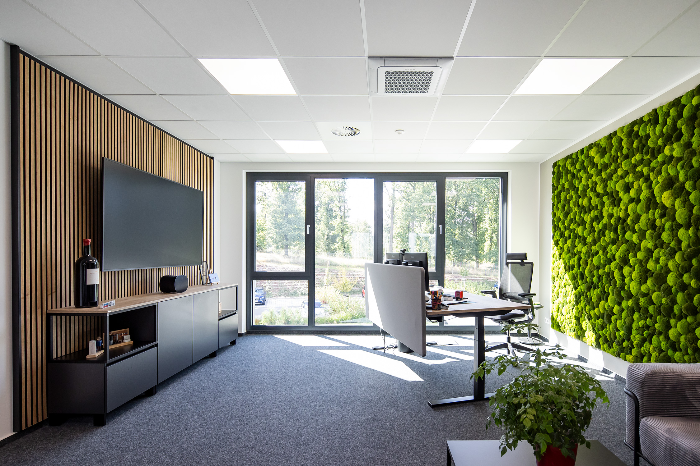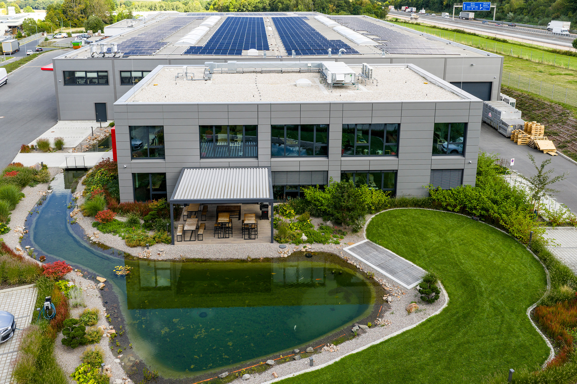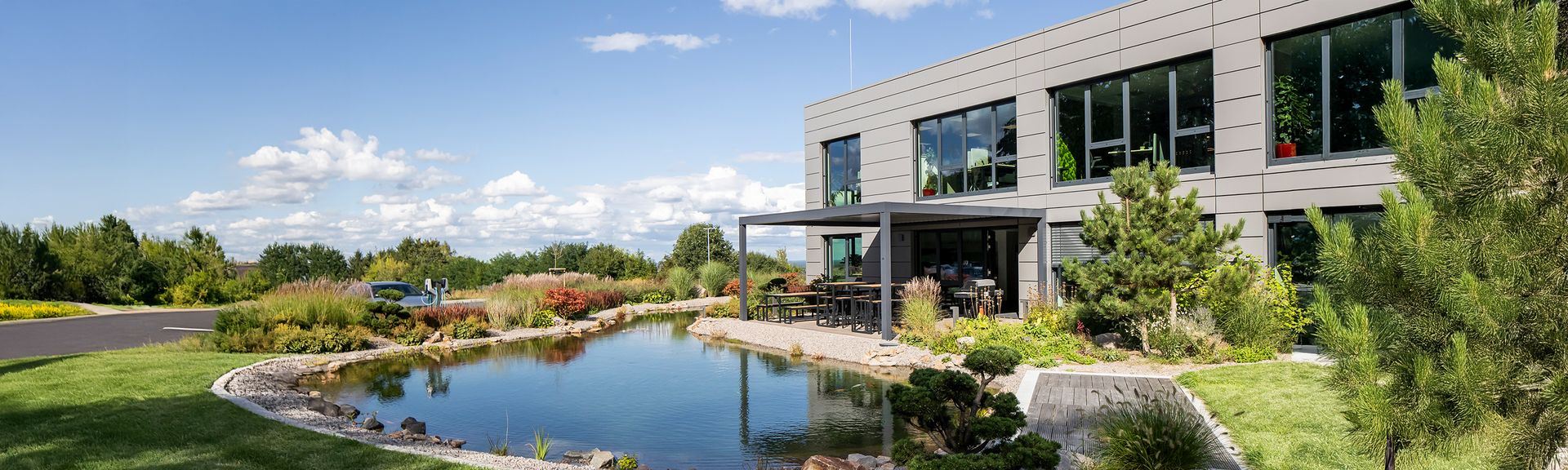Das Energiekonzept entwickelte FREYLER gemeinsam mit TLC: Das Bürogebäude wird über eine Wärmepumpe mit Fußbodenheizung beheizt, die Produktionshalle über ein intelligentes Wärmepumpen- und Luftverteilsystem. Die umfangreichen Elektroinstallationen umfassten u.a. den Bau einer Trafostation, die Anschlüsse der Maschinen und Anlagen sowie eine leistungsstarke PV-Anlage. Im Außenbereich fördern Grünflächen und eine Teichanlage die Biodiversität.
