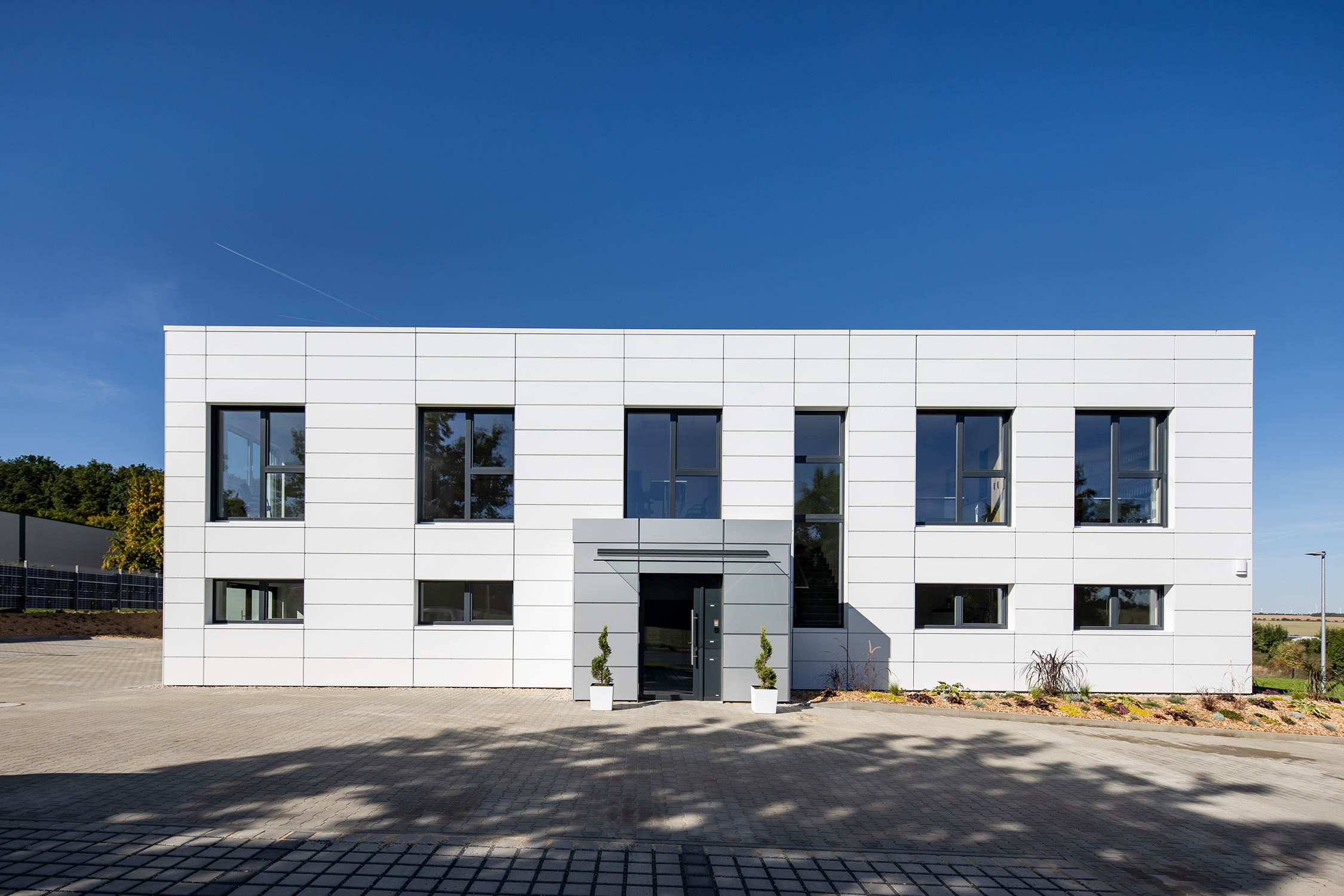 Der Verwaltungsbau umfasst 585 m² Nutzfläche und wurde in Betonfertigteilbauweise mit einer hellen Fassade aus horizontal ausgerichteten Stahlblech-Paneelen errichtet. Beheizt wird es mit einer Luft-/Wasser-Wärmepumpe in Kombination mit einer Fußbodenheizung.